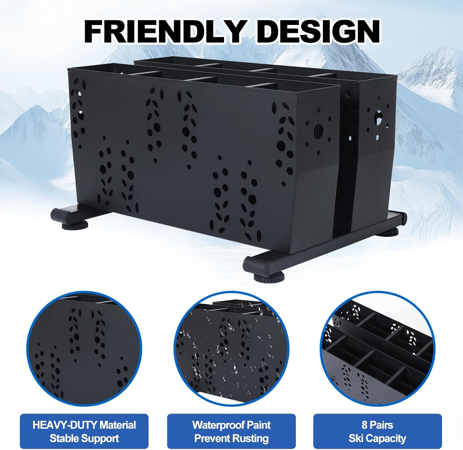 - 【8 PAIRS FREESTANDING SKI RACK】Holds up to 8 pairs of ski + poles. Holds skis up to 140mm wide at the tails, including race skis, all-mountain skis, twin tips, and powder skis. A perfect ski organizer for your garage, or ski lodge.