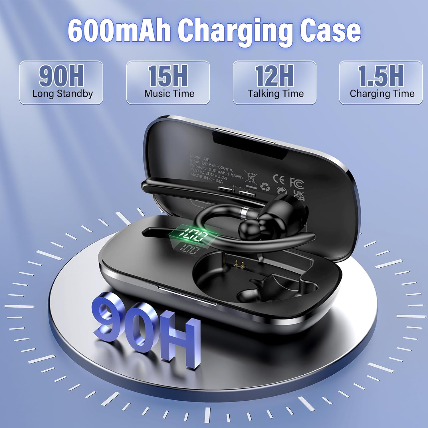 - 90Hrs Marathon Battery & Dual Charging: G9 Hands free noise canceling headphones features a smart LED display, delivering 15hrs nonstop music/12hrs talk time on a 1.5hr charge (via USB-C ports on both earpiece and charging case), plus 90hrs standby โ triple the runtime of standard wireless headsets. Built for endurance: this Bluetooth earpiece for iOS, Android, cell phones, laptops powers through long-haul drives, office tasks, and weekend errands โ all without battery anxiety.