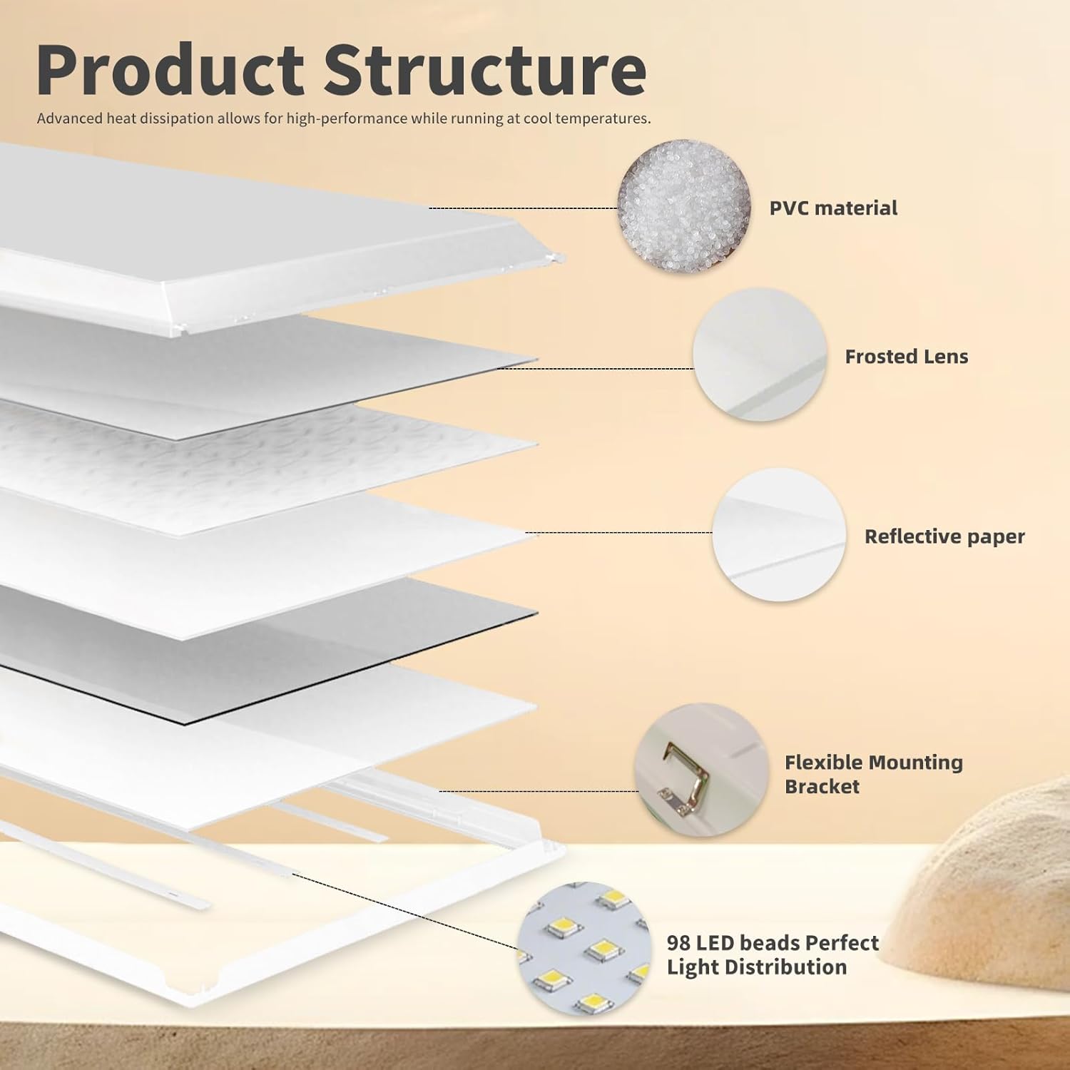 - Size & Power:Adopting the industry-standard 2x4 Feet size, it perfectly fits most pre-reserved ceiling openings; offers three power choose (30W/40W/50W) — 30W is suitable for local lighting in garages, 40W for zoned lighting in offices, and 50W meets the high-brightness requirements of open areas in malls, balancing brightness and energy consumption.