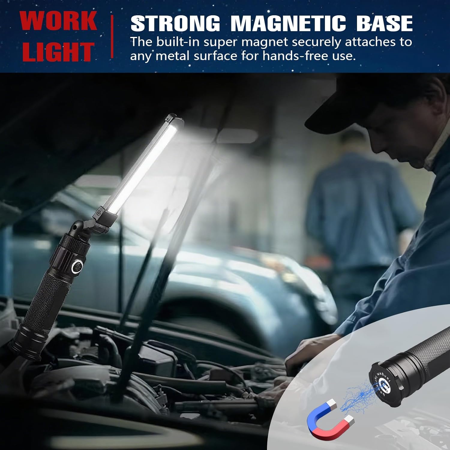 - 【Portable and Practical】:This magnetic work light features COB + LED dual light sources and a 360° adjustable head for multi-angle illumination. Folds down to just 7 inches for easy portability—perfect as a mechanic’s light, LED task light, or outdoor flashlight