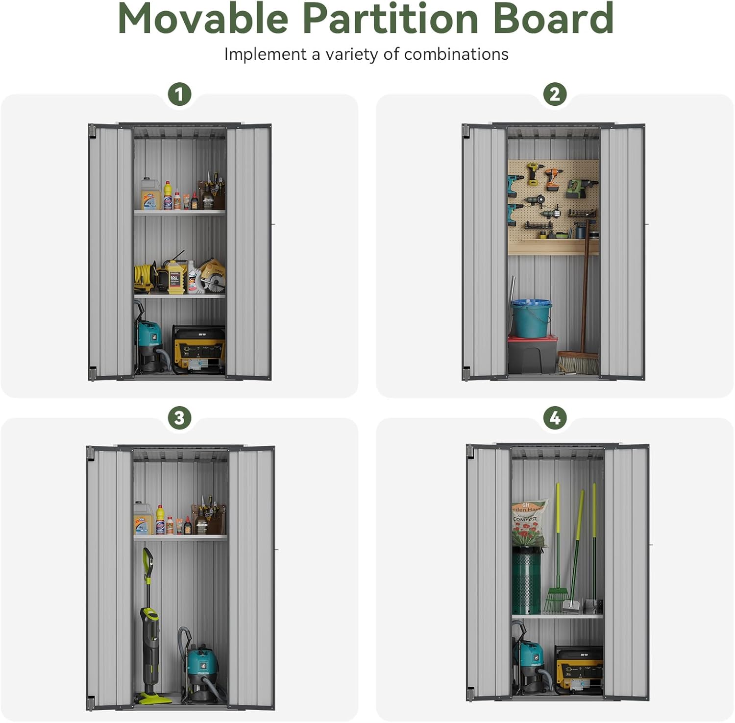 - Long-Lasting All-Weather Protection: Crafted from heavy-duty galvanized steel, this weatherproof outdoor storage cabinet withstands rain and sun. It serves as a waterproof metal vertical storage shed, providing reliable, year-round defense for tools, gardening essentials, or seasonal items, with resin-like durability for outdoor resilience.
