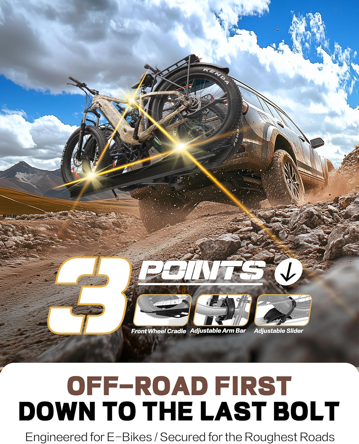 - DURABLE and SAFE: Young Electric bike rack is constructed with reinforced steel and aluminum which makes it durable and powerful enough to carry 3 bikes or ebikes. Comes with 3-arm fix, patent secure wheel cradles and anti-wobble structure, that secure your E-bikes in place without swaying and knocking against vehicle.