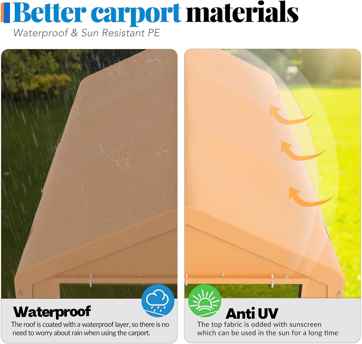- 【All-season Heavy Duty Carport】The roof is made of 180G PE material that effectively blocks 90% of UV rays and protects your vehicle from seasonal weather conditions. The high-quality rust-resistant and corrosion-resistant white powder-coated steel frame prevents cracking, peeling, rusting, and corrosion.