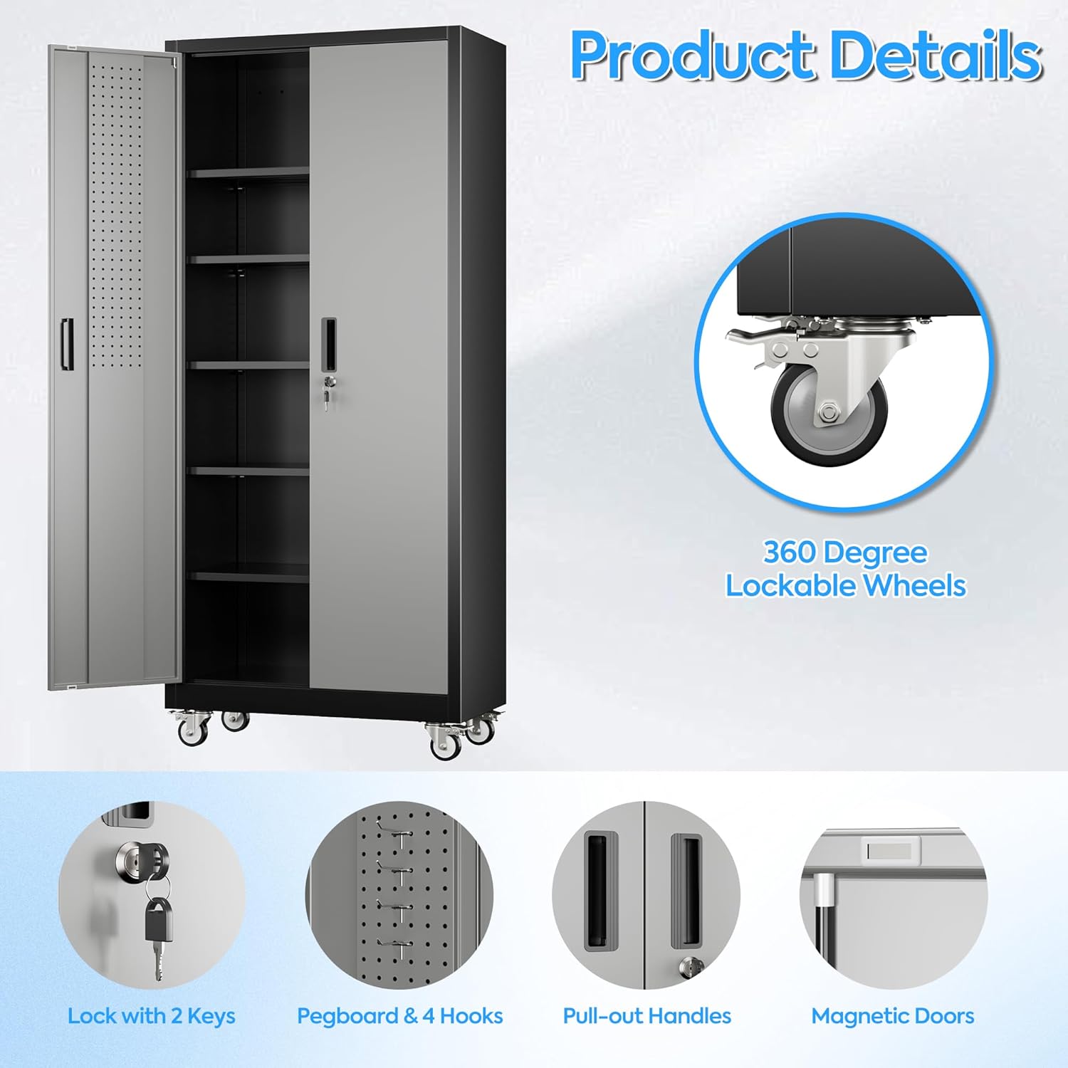 - Ample & Flexible Storage Solutions: Maximize organization with 5 adjustable shelves (customizable height) and pegboard on both doors, paired with 4 hooks for hanging tools, accessories, or gear. This design of the garage storage cabinet with wheels adapts to your needs, whether storing heavy-duty items or small essentials;