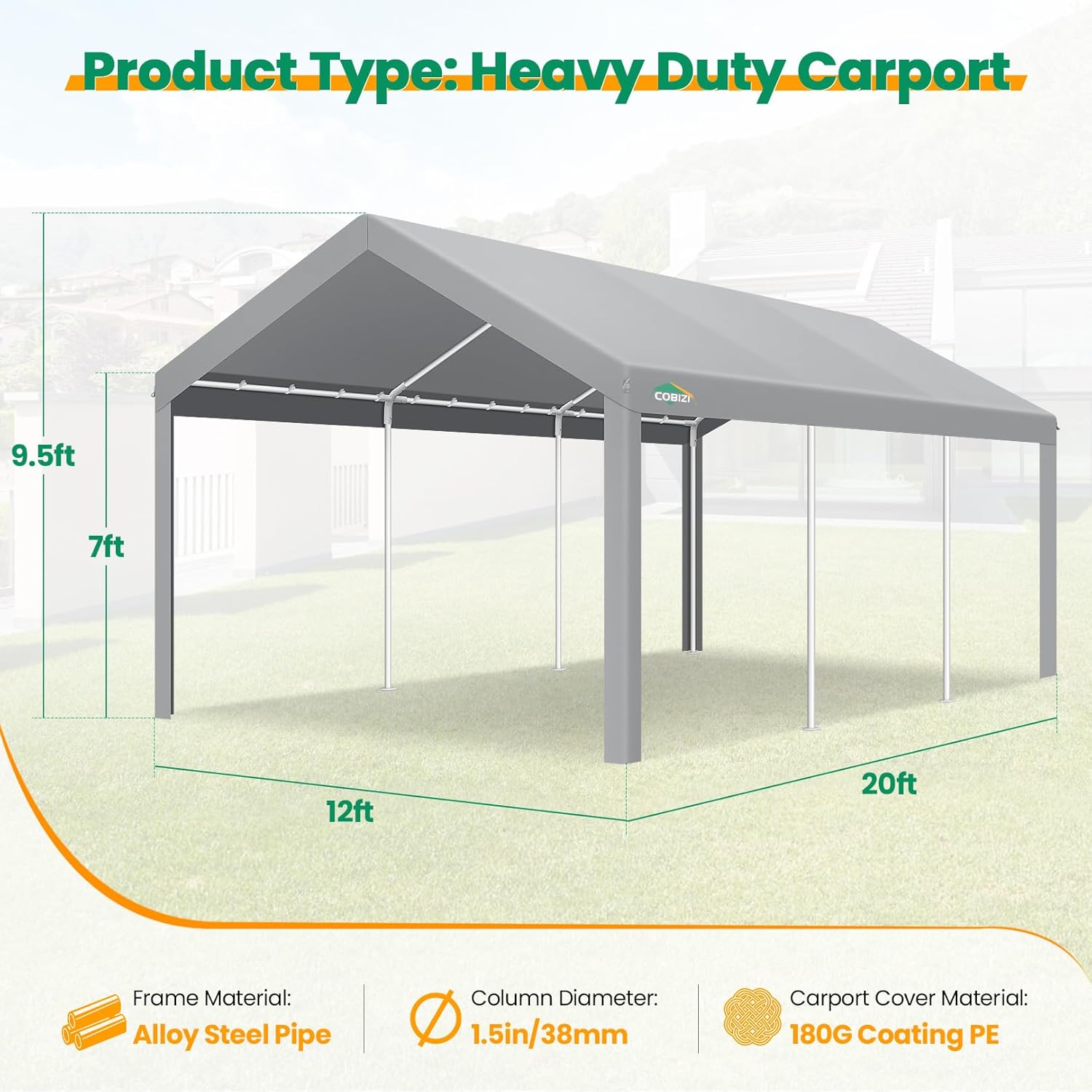 COBIZI Carport Canopy 12x20 Heavy Duty Car Tent Garage, Galvanized Frame Car Canopy Outdoor Shelter Waterproof & UV Protected with Built-in Sandbags & All-Season Tarp for Car Boat Truck, Gray