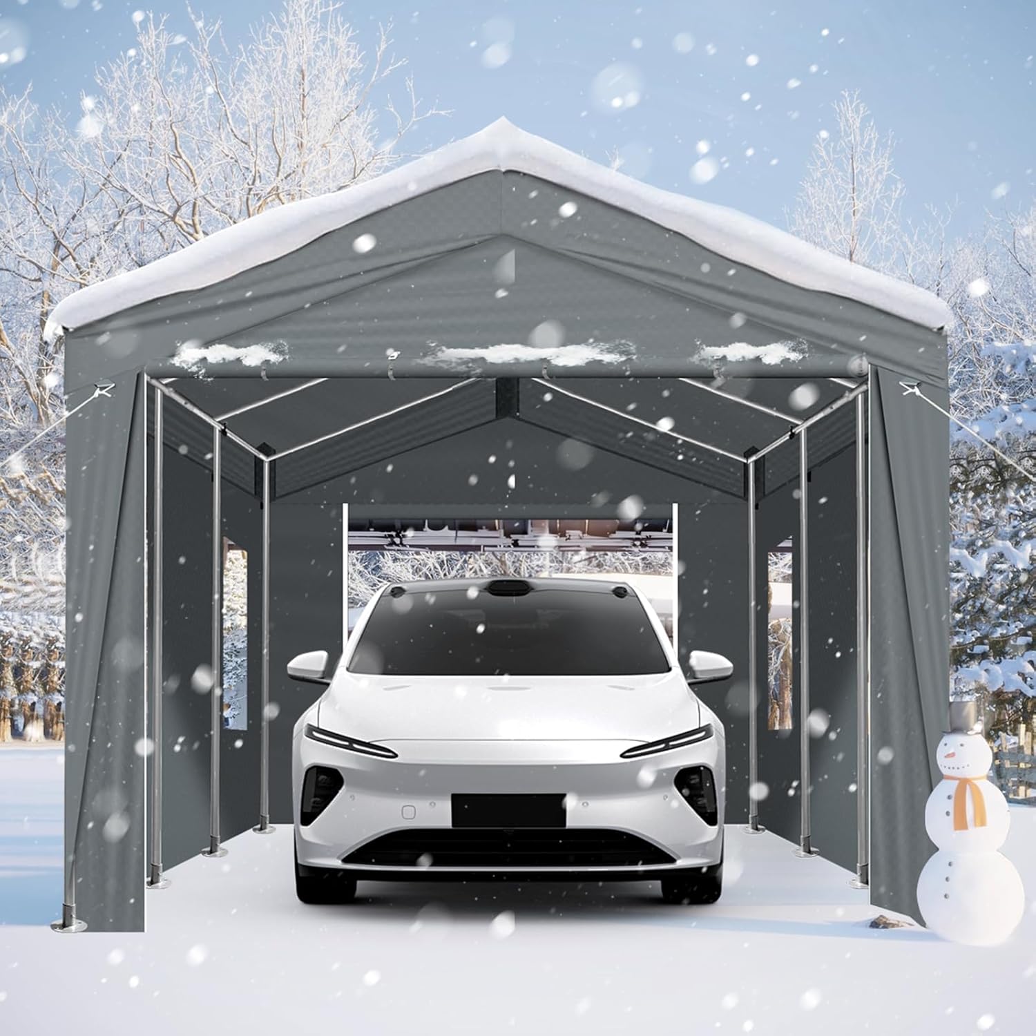 - All-Season Car Canopy: This all-weather portable garage features a reinforced triple-layered polyethylene fabric that is tear-proof, waterproof, and UV resistant. The robust canopy attaches firmly to the frame via high-quality elastic ball straps and secure buckles, delivering year-round protection for vehicles and stored items