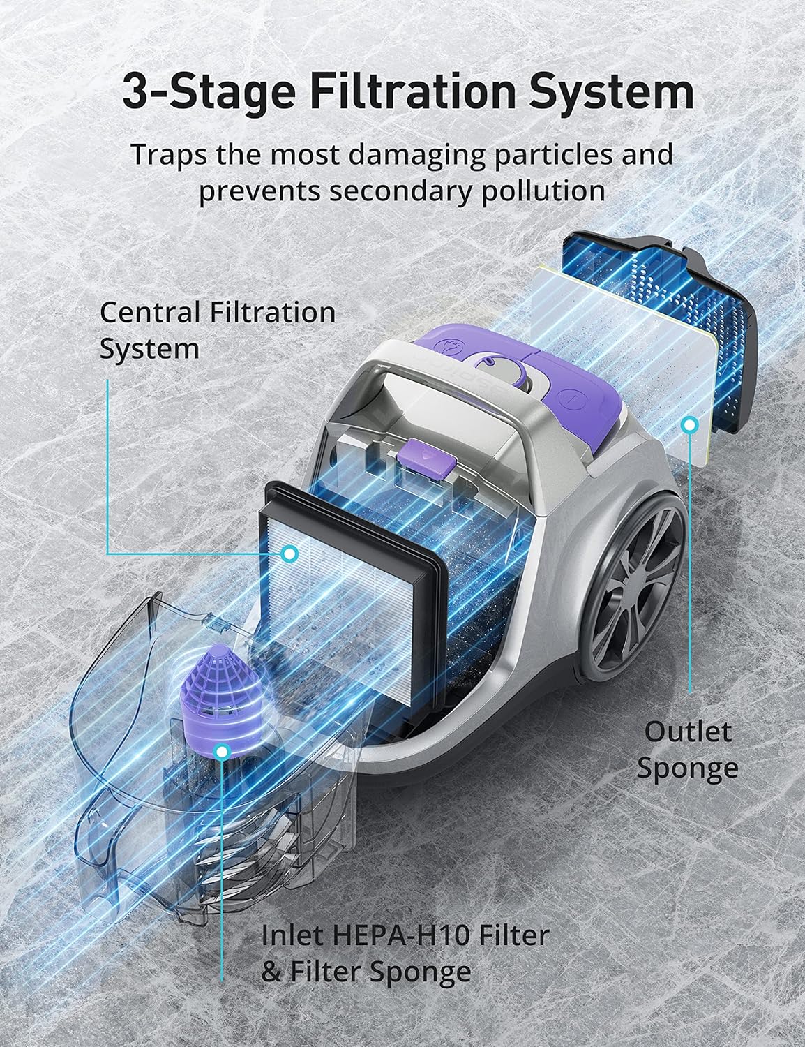 Aspiron Canister Vacuum, Upgraded 1600W Bagless Canister Vacuum Cleaner, Auto Cord Rewind, H13 HEPA Filter, 3.7Qt Large Capacity, 5 Tools for Hard Floors, Carpet, Pet, Upholstery, Tiles, Car, Violet