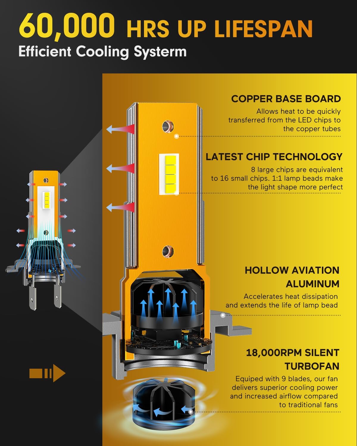 - 【Ultra Bright 45000LM Output】Equipped with high-intensity chips, these upgraded H7 bulbs deliver an impressive 45,000 lumens of brightness with a crisp 6500K white color temperature, significantly enhancing visibility for safer night driving. Perfect replacement for dim or yellowish factory H7 fog lights or headlamps.