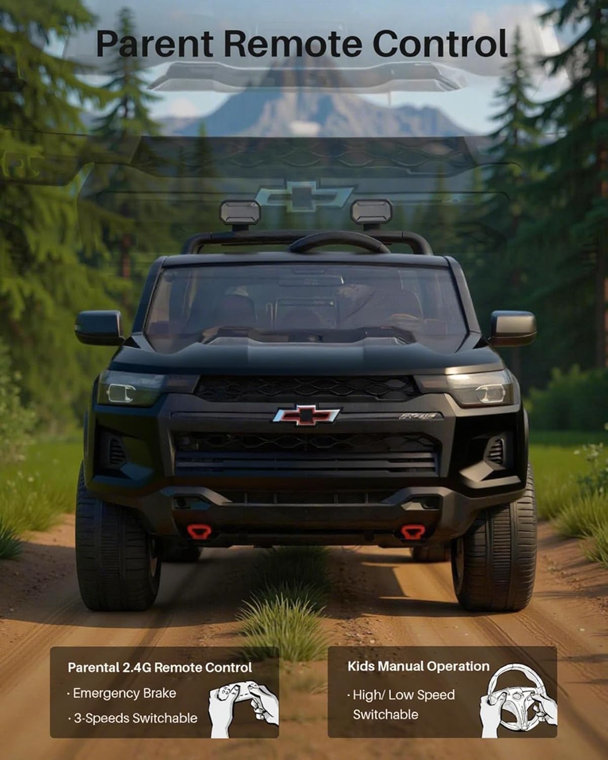 Joywhale 24V Ride on Truck 4WD Kids Electric Vehicle Licensed Chevorlet Ride on car with 7AH Big Battery, 320W Powerful Motors, 2 Seats, Music, 4 Wheel Suspension, 2 Speeds, LED Lights,Black