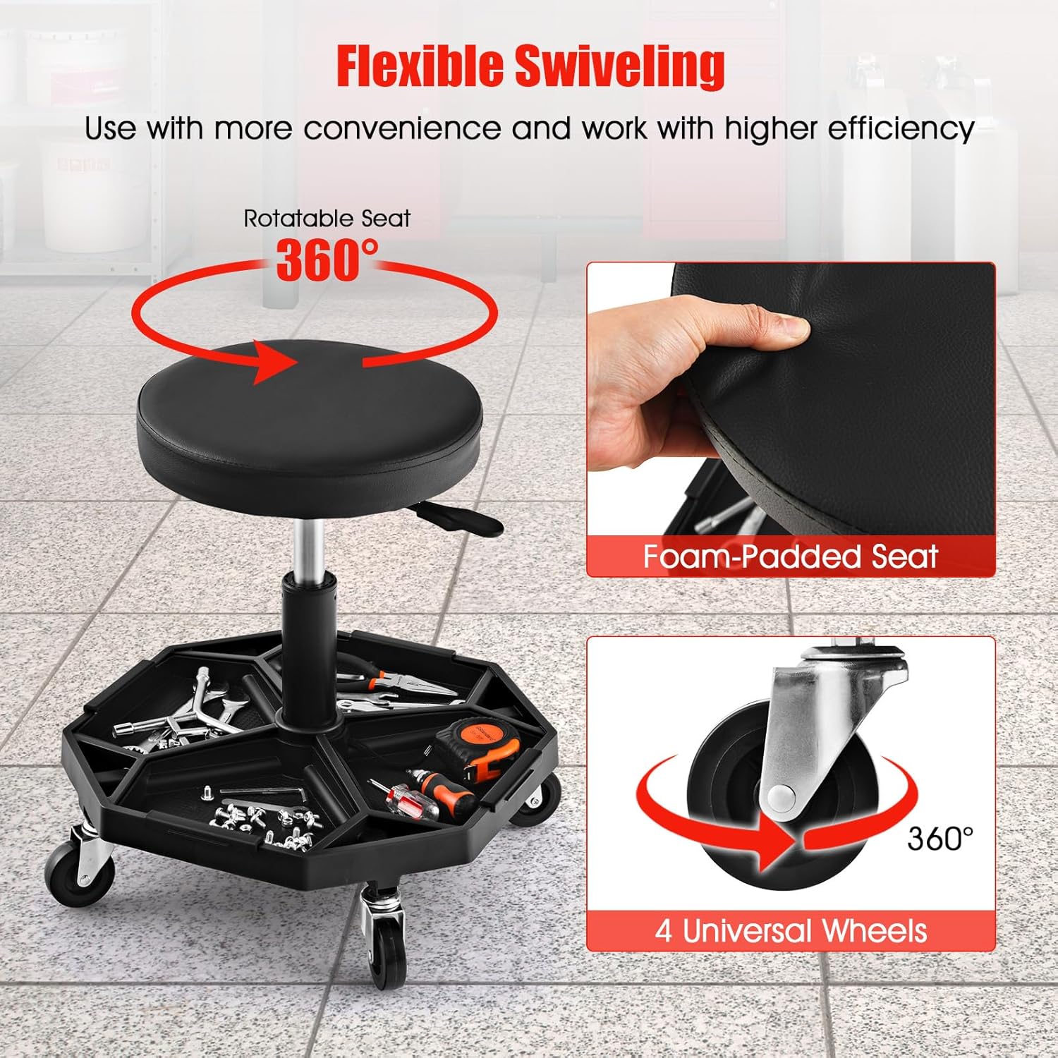 - Adjustable Height & Swiveling Creeper: With an automatic lift level, our rolling mechanic stool can easily adjust the seat height from 16" to 22", allowing different users to find their ideal seat position without having to bend or kneel while working. In addition, the seat rotates 360Β°, which is especially useful for tasks that require reaching different areas without moving the entire stool.