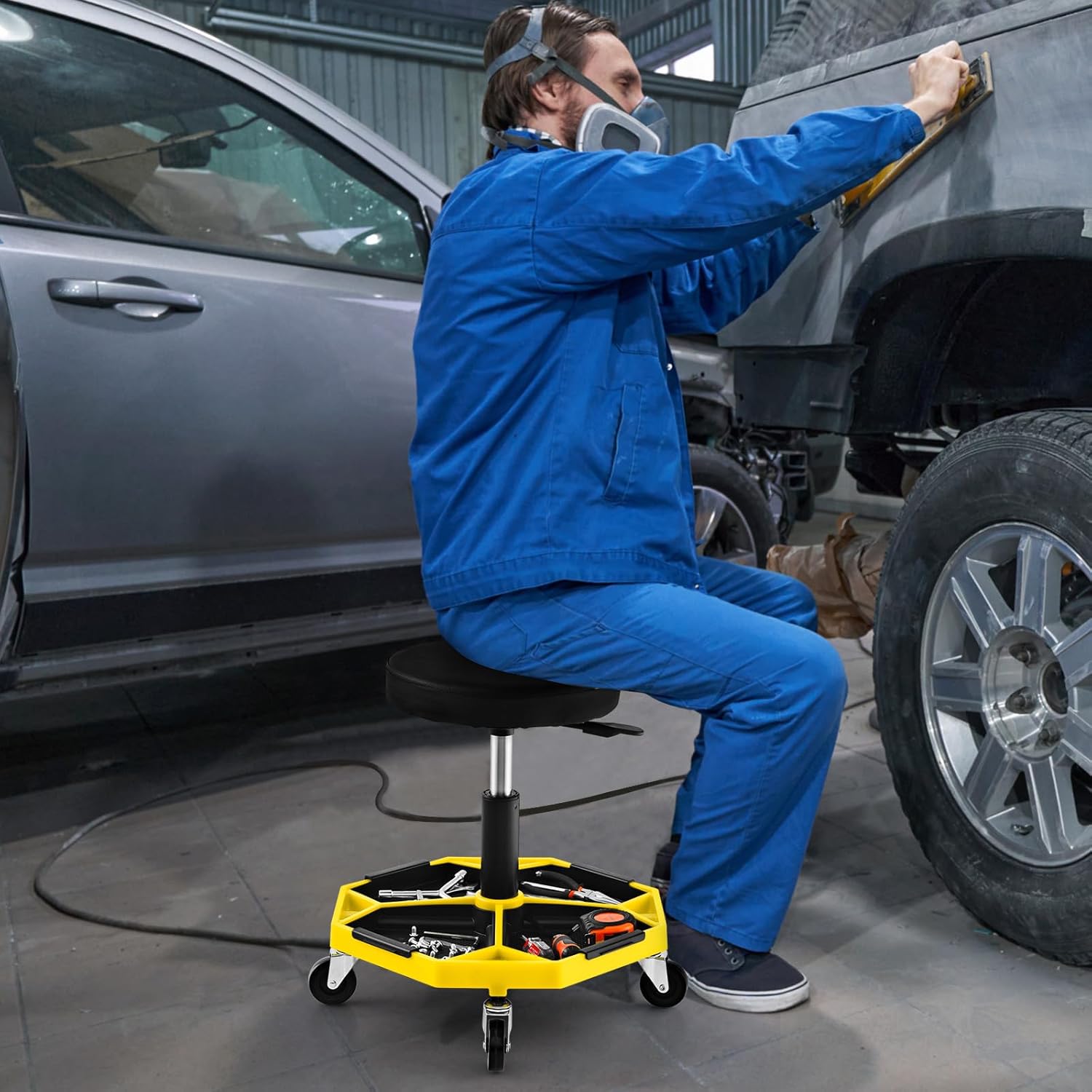 - Versatile Rolling Mechanical Stool: Designed with 4 universal wheels, this rolling stool allows for smooth movement around your work area, perfect for use in garage, workshop, home and repair store. Its practicality extends to tasks like repairing or cleaning vehicles, furniture and other projects to make your job more efficient.