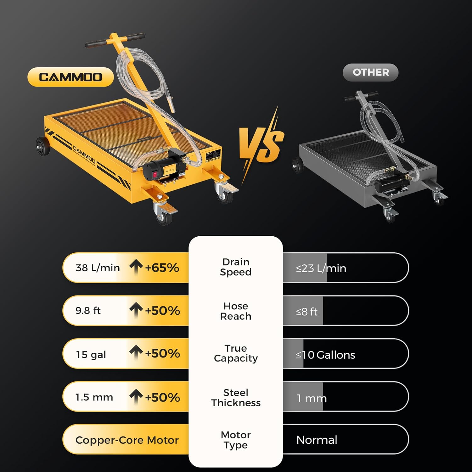 • High Capacity:Oversized 31.5" x 19.7" x 5.7"Steel tank delivers a verified 15 gallons and provides a bigger footprint than standard oil drain pans so shop owners, fleet managers, farmers and DIYers can drain a full-size pickup, two RVs or four sedans in one go with less lifting, fewer trips to the recycler and more time for paid jobs. It works with all common waste oils (motor, hydraulic, etc.)—gasoline explicitly excluded.