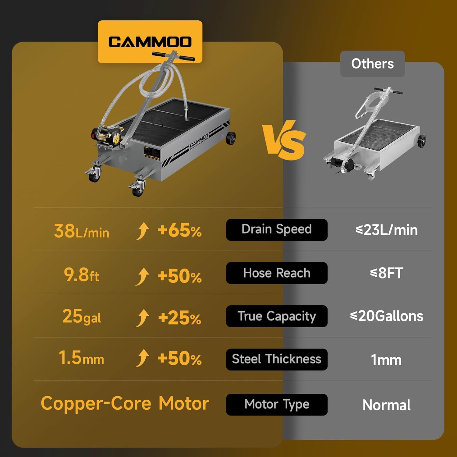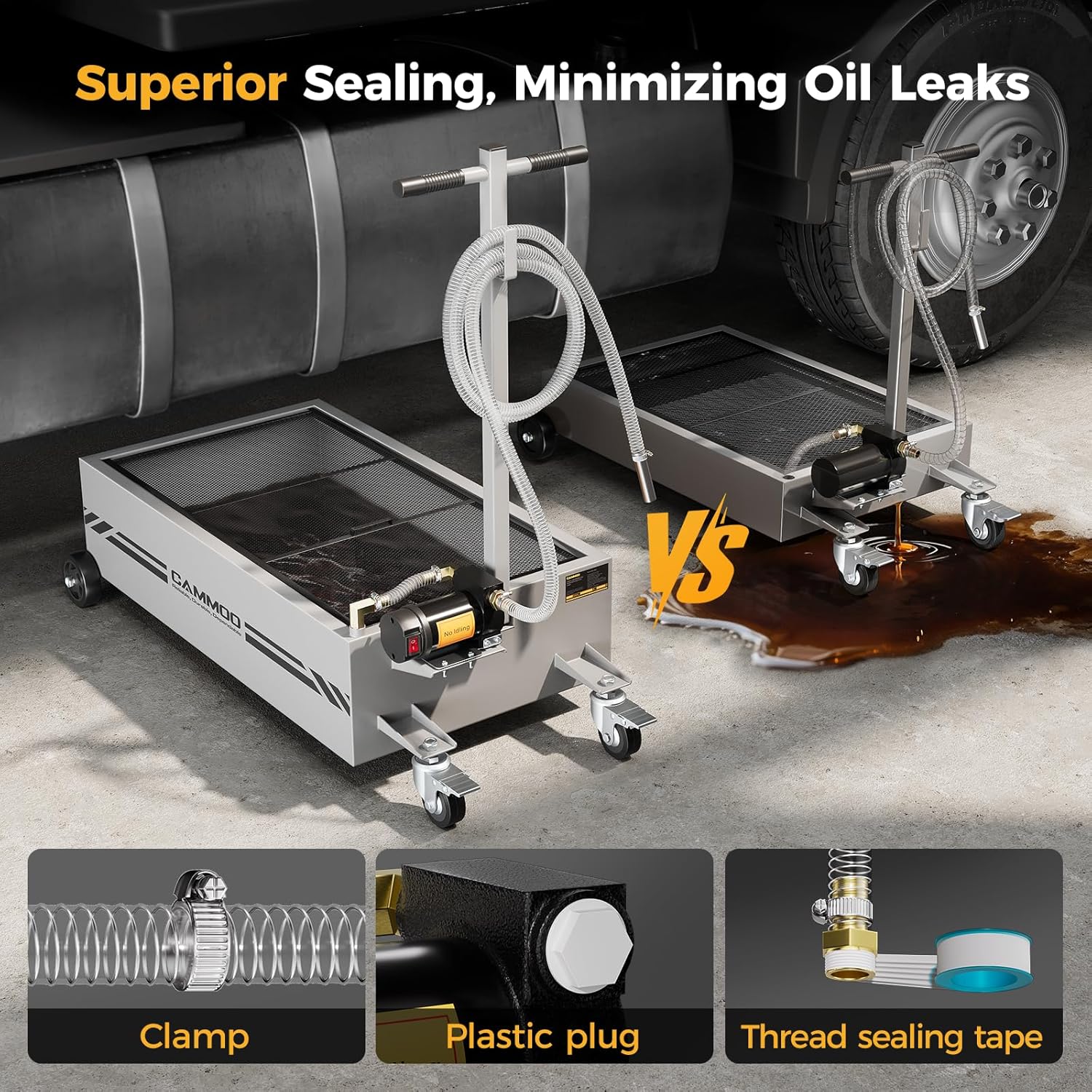 • High Capacity:Oversized 39.76" x 23.23" x 8.5" steel tank delivers a verified 25 gallons and provides a bigger footprint than standard oil drain pans so shop owners, fleet managers, farmers and DIYers can drain a full-size pickup, two RVs or four sedans in one go with less lifting, fewer trips to the recycler and more time for paid jobs. It works with all common waste oils (motor, hydraulic, etc.)—gasoline explicitly excluded.