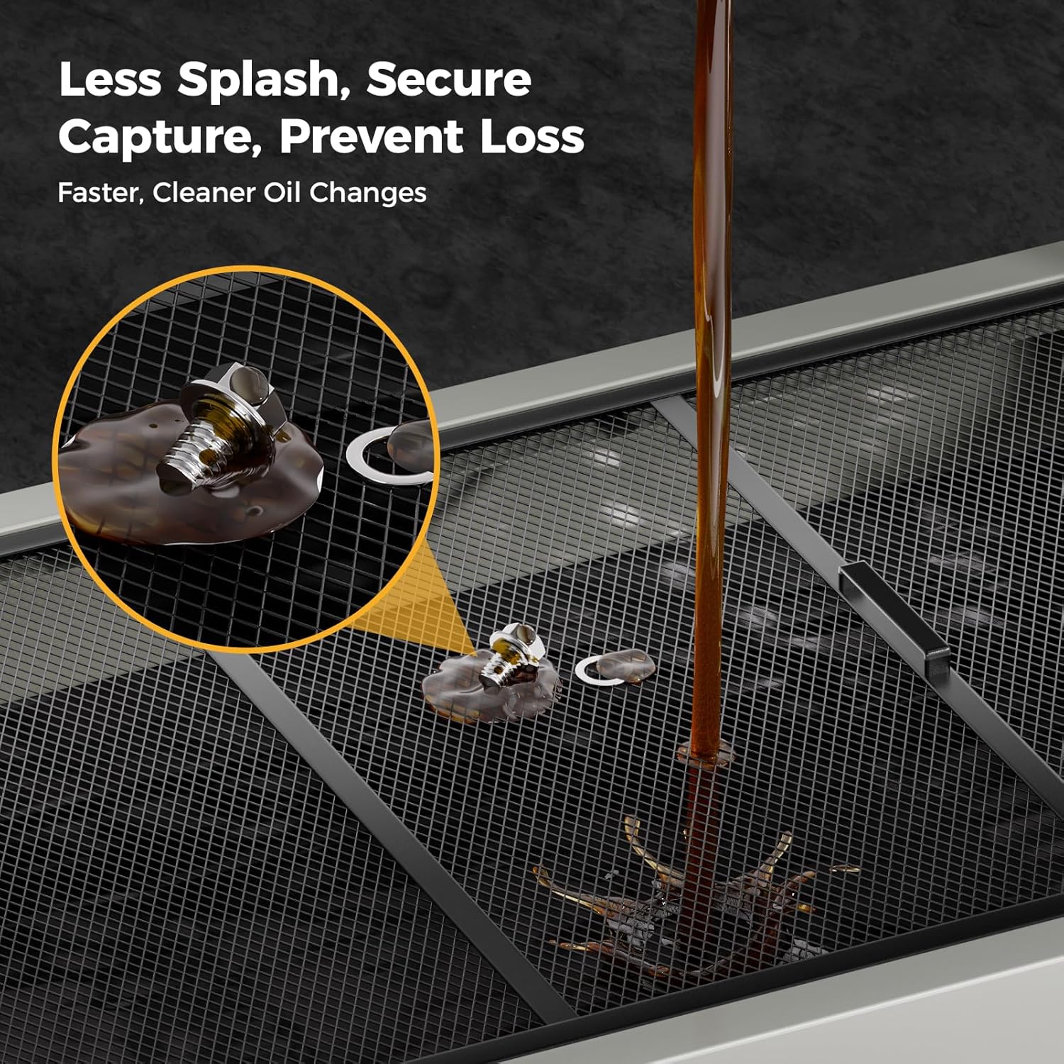 • User-Friendly Design:The 32.8× 16.9" filter screen with smaller holes on oil drain pans minimizes splatters and catches dropped parts, keeping floors clean and saving time. Its 1.2 mm metal frame resists warping, ensuring durability for oil drain pans. The T-handle folds from 40–180°, collapses flat for storage, and reaches easily under vehicles—perfect for maneuvering oil drain pans. Two fixed 4-inch wheels and two 3-inch swivel wheels with brakes ensure stable, secure positioning for oil drain pans—even on slopes. Together, these elements make every oil change with oil drain pans quicker, neater, and hassle-free.