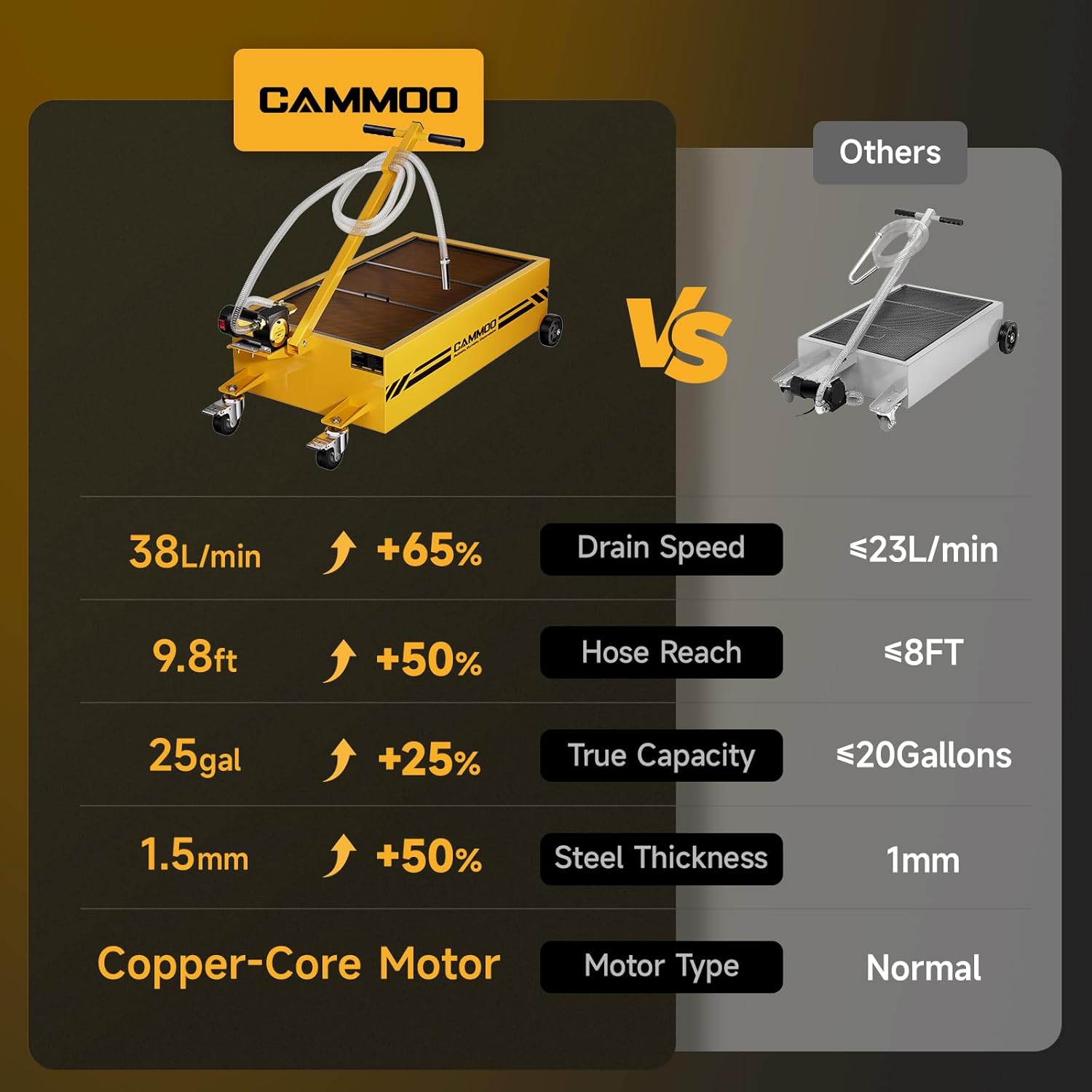 • High Capacity:Oversized 39.76" x 23.23" x 8.5" steel tank delivers a verified 25 gallons and provides a bigger footprint than standard oil drain pans so shop owners, fleet managers, farmers and DIYers can drain a full-size pickup, two RVs or four sedans in one go with less lifting, fewer trips to the recycler and more time for paid jobs. It works with all common waste oils (motor, hydraulic, etc.)—gasoline explicitly excluded.