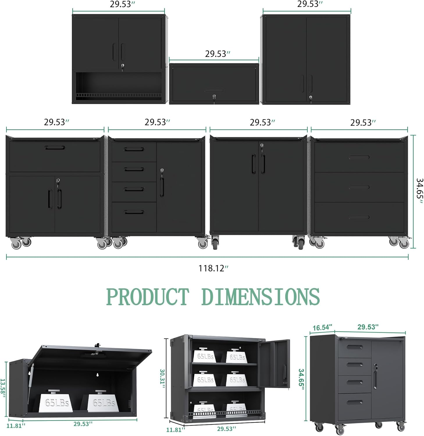Metal Tool Cabinet,Garage Storage Cabinet System,Wall Cabinet & Locking Rolling Tool Cabinet with Doors and Adjustable Shelves,Steel Tool Cabinets for Home,Office (7 Pcs-StyleA, Black)