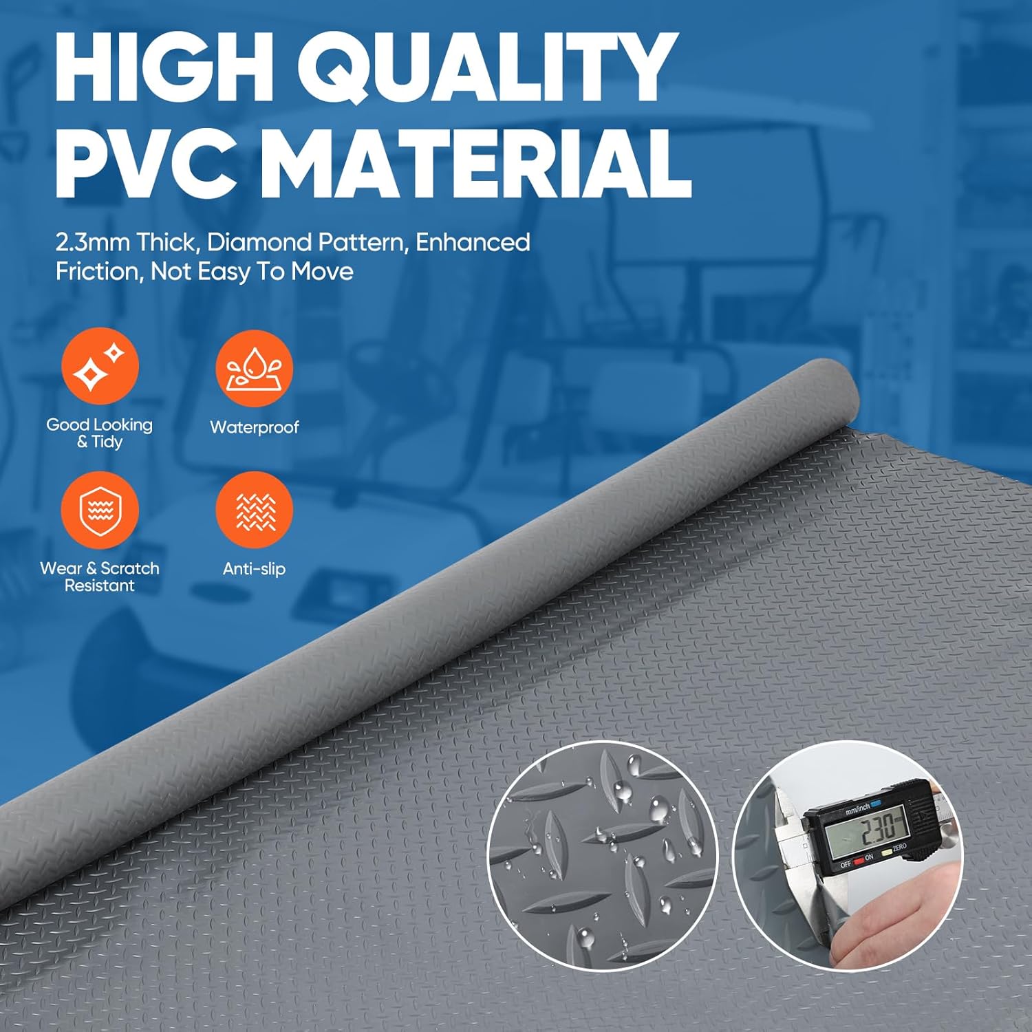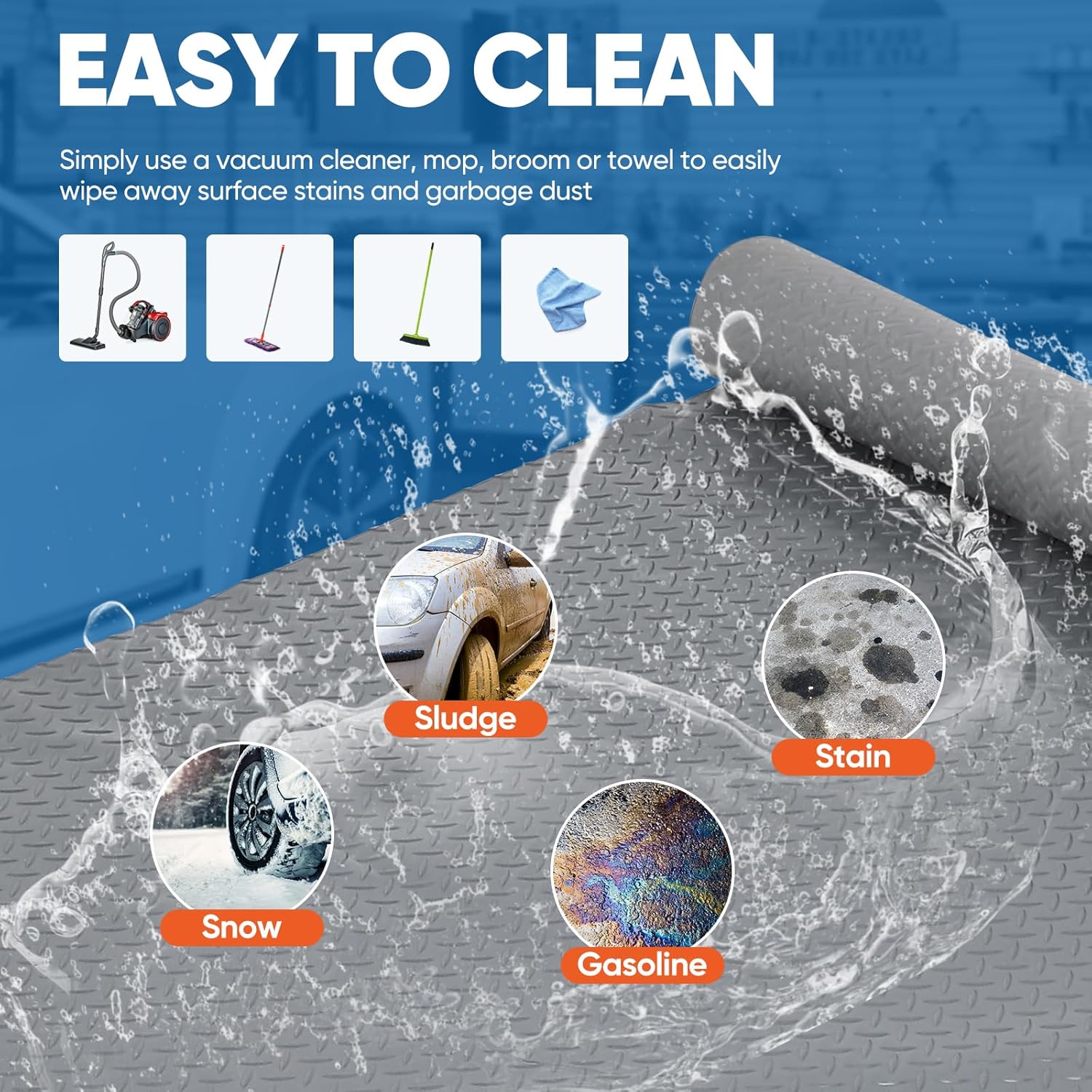 - WATERPROOF & DURABLE: This garage mat effectively blocks the penetration of water, oil, mud, and various stains, thanks to its powerful waterproof capabilities. Whether in rainy, snowy, or other weather conditions, this waterproof feature not only protects the floor from moisture and stains but also makes cleaning extremely easy. You can simply use a vacuum cleaner, broom, or damp cloth to remove dust and dirt from the diamond plate rubber mat's surface, quickly restoring its clean appearance.