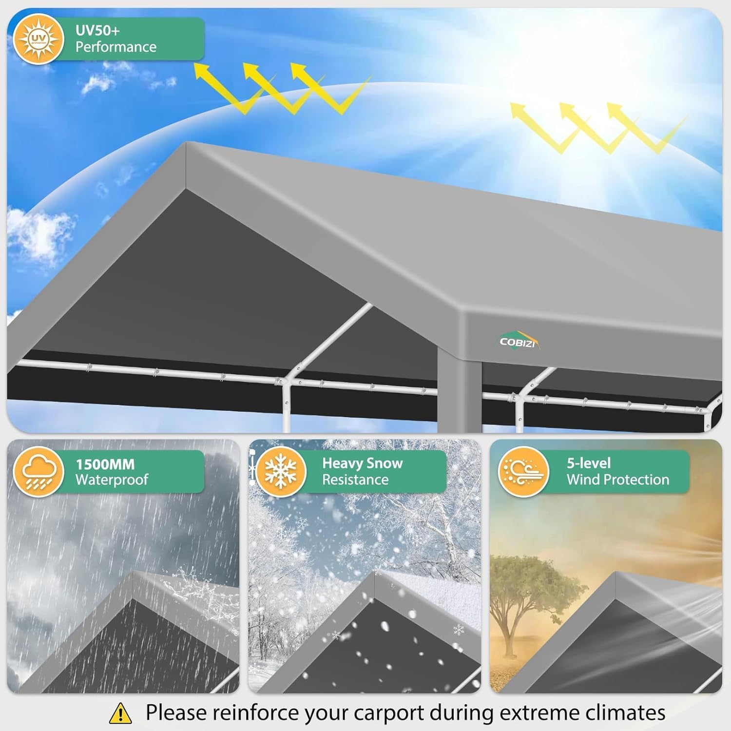 COBIZI Carport 10x20ft Heavy Duty Portable Garage, 2.0 Powder Coated Frame(Better Than Galvanized), Waterproof Shelter with Built-in Sandbags, for Car/Boat/SUV, Gray