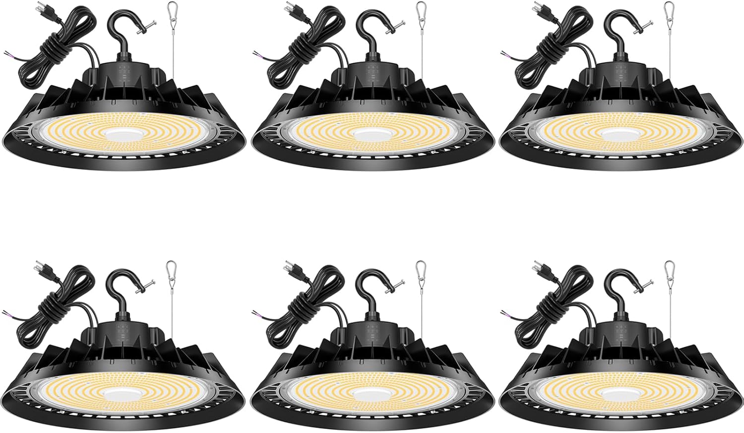 - 1 Minute Installation: This high bay ceiling light includes the 5ft cable, US ground 3-prong plug, safety rope and hook, you just need 3 steps to install it. First, hang it in the ceiling hook, Then connect the safety rope, at last plug it in to an outlet, it is perfect for you to solve your problem such as short cable, unsafe etc