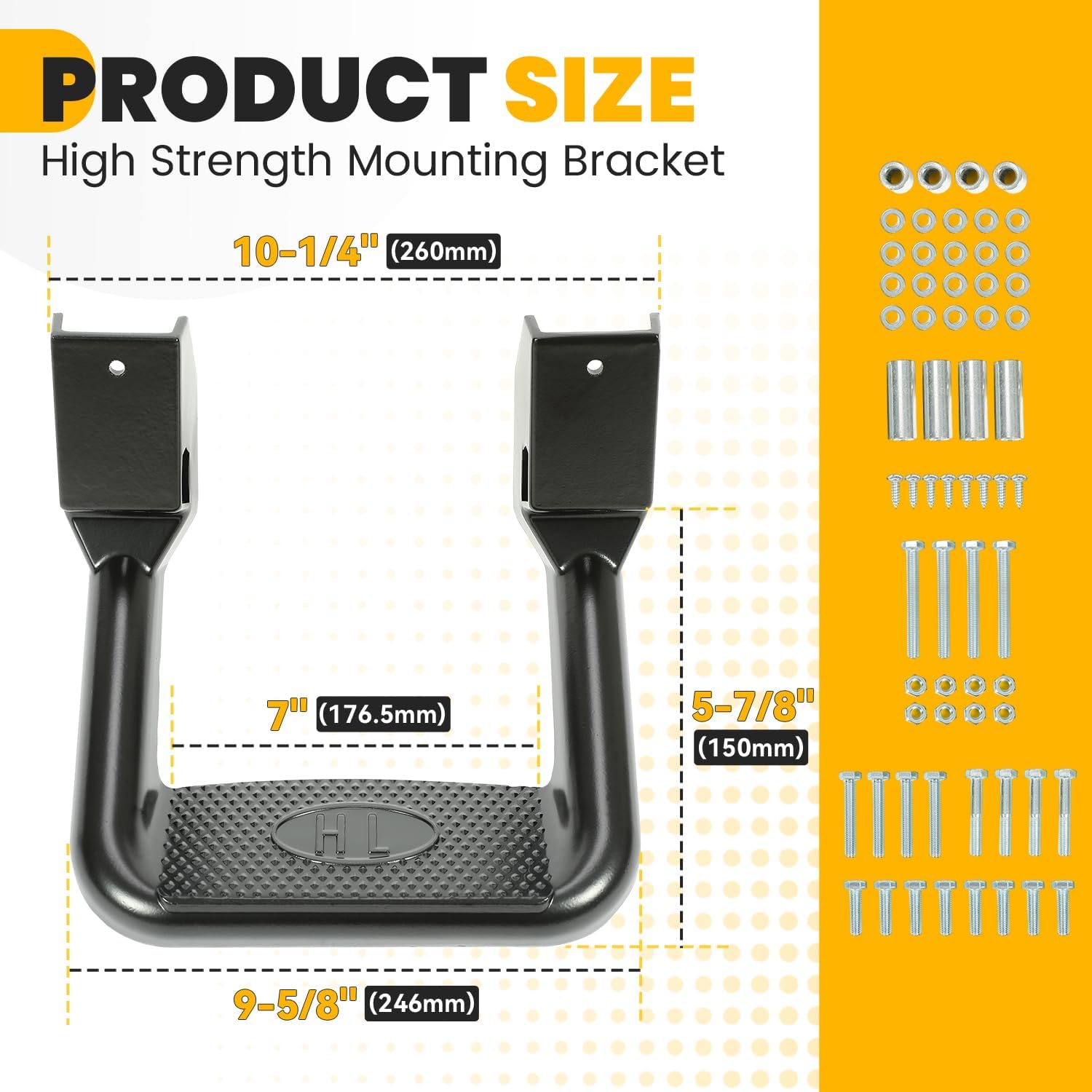 - Package: You will receive a pair of side step. Includes all pictured mounting hardware and installation instructions. Installation requires simple screwing (as per manual)