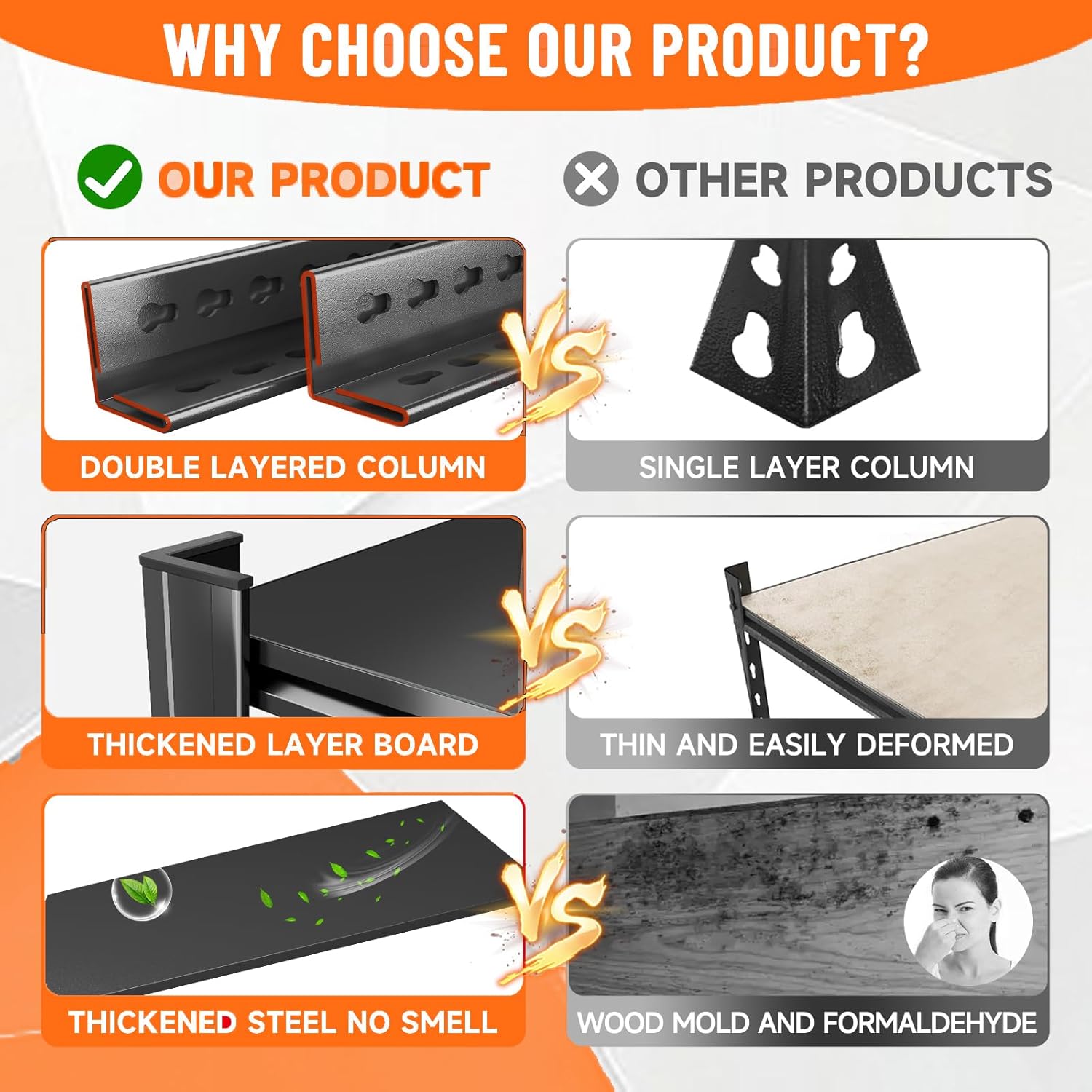 - ăGarage Shelving Heavy Duty Load 3500LBS ă This storage shelves features double-layer reinforced uprights with support ribs on each shelf level. Constructed from a high-quality steel frame and durable steel decking, each shelf supports up to 700 LBS, delivering a total capacity of 3500 LBS. This robust 5-tier shelving unit offers exceptional stability and strength, allowing you to store more items securely.