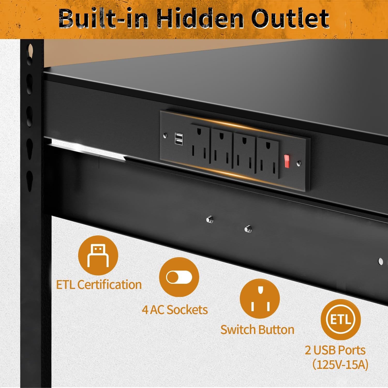 - Outlet with USB Ports: With 4 AC sockets, 1 switch button and 2 USB ports, our workbench with pegboard can charge multiple devices to power up your productivity. You can enjoy easy access to 4 standard US 3 prong plugs and fast charging USB ports