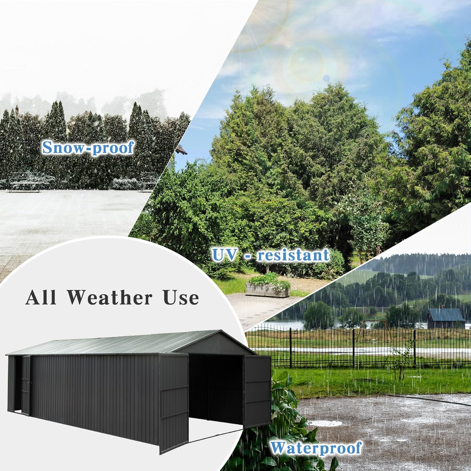 - Dual-Door Access System - The extra-wide double front doors facilitate easy drive-in access for vehicles and large equipment, while a dedicated side door offers quick daily walk-in entry. A built-in latch hook securely holds the main doors fully open during loading and unloading, preventing unexpected closures.