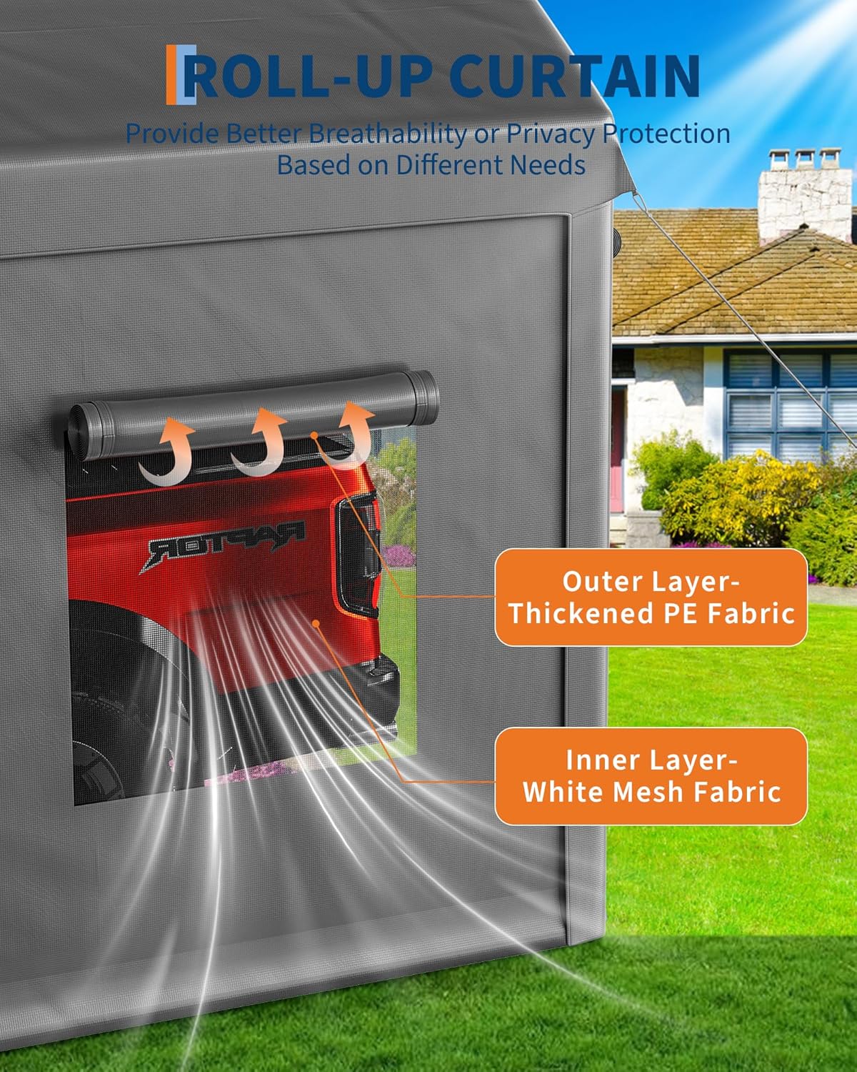 - 【Ventilated with Roll-Up Windows & Doors】Designed for convenience, this garage tent shelter features roll-up doors and windows for easy access and improved airflow. It’s versatile for parties, weddings, outdoor exhibitions, or storage—providing shaded, weather-resistant shelter.