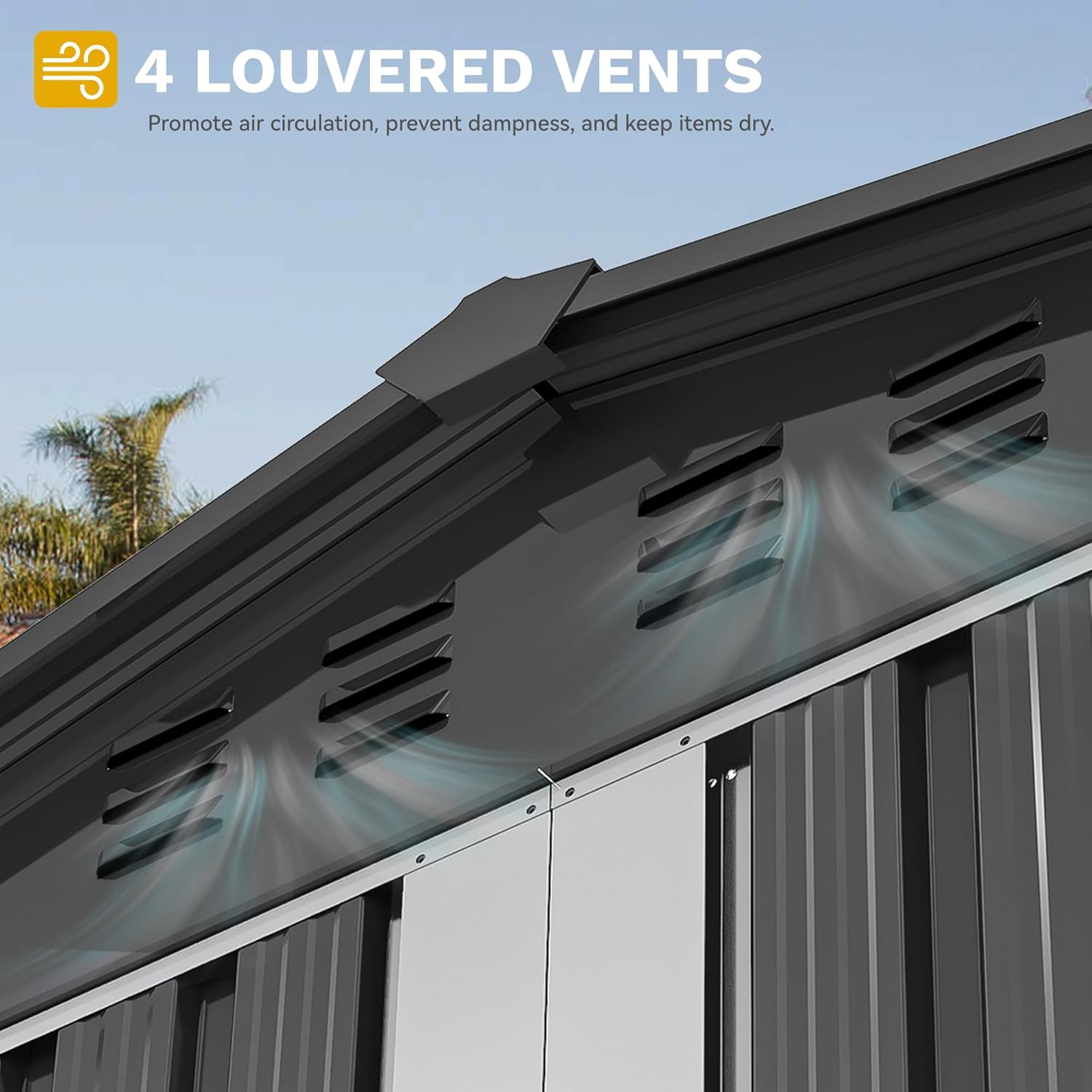 - Effective Ventilation & Sloped Roof: Strategically positioned ventilation vents and a sloped roof in our backyard storage shed eliminate humidity and promote airflow, preventing water accumulation and safeguarding your tools